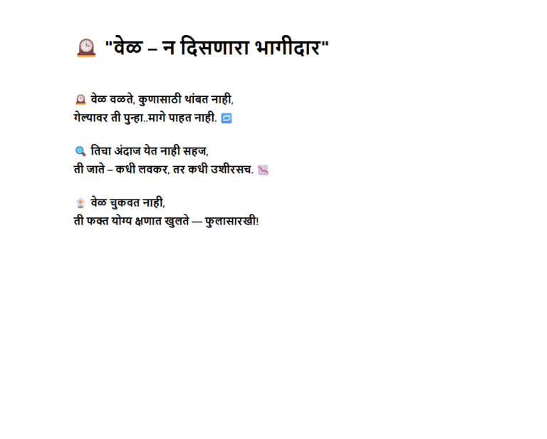 ЁЯХ░я╕П рд╡реЗрд│ рд╡рд│рддреЗ, рдХреБрдгрд╛рд╕рд╛рдареА рдерд╛рдВрдмрдд рдирд╛рд╣реА,рдЧреЗрд▓реНрдпрд╛рд╡рд░ рддреА рдкреБрдиреНрд╣рд╛..рдорд╛рдЧреЗ рдкрд╛рд╣рдд рдирд╛рд╣реА. ЁЯФБ ЁЯФН рддрд┐рдЪрд╛ рдЕрдВрджрд╛рдЬ рдпреЗрдд рдирд╛рд╣реА рд╕рд╣рдЬ,рддреА рдЬрд╛рддреЗ тАУ рдХрдзреА рд▓рд╡рдХрд░, рддрд░ рдХрдзреА рдЙрд╢реАрд░рд╕рдЪ. ЁЯУЙ ЁЯМ╝ рд╡реЗрд│ рдЪреБрдХрд╡рдд рдирд╛рд╣реА,рддреА рдлрдХреНрдд рдпреЛрдЧреНрдп рдХреНрд╖рдгрд╛рдд рдЦреБрд▓рддреЗ тАФ рдлреБрд▓рд╛рд╕рд╛рд░рдЦреА! ЁЯОн рдХрдзреА рд╢рд╣рд╛рдгреА рд╡рд╛рдЯрддреЗ, рдХрдзреА рдлрд╕рд╡реА рдирд┐рдШрддреЗ,рдХрдзреА рдЬрд╡рд│ рдЕрд╕реВрдирд╣реА рд╣рд╛рддреАрдЪ рди рдЯрд┐рдХрддреЗ. ЁЯд▓ ЁЯдР рддреА рдмреЛрд▓рдд рдирд╛рд╣реАтАжрдкрдг рдЖрдкрдг рдЧрдкреНрдк рдмрд╕рд▓реЛ,рдХреА…
